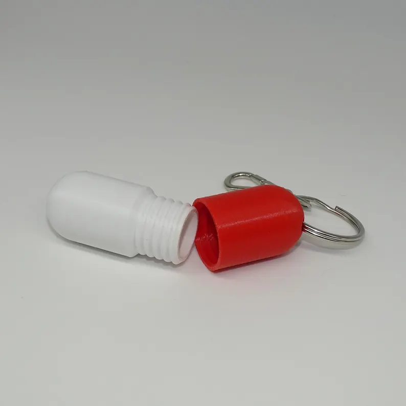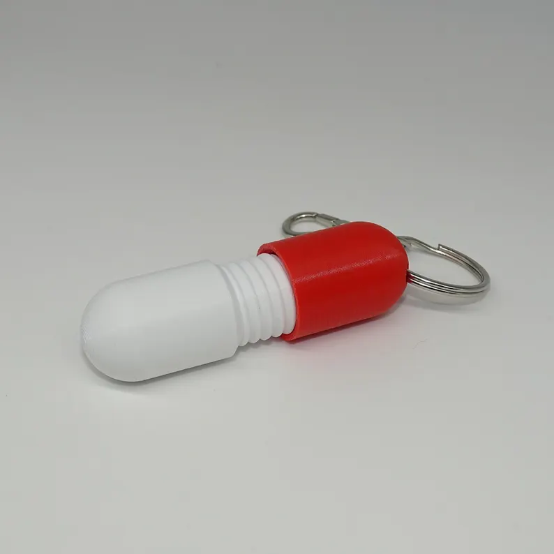 Compacte pill capsule sleutelhanger voor het veilig meenemen van medicatie of supplementen.